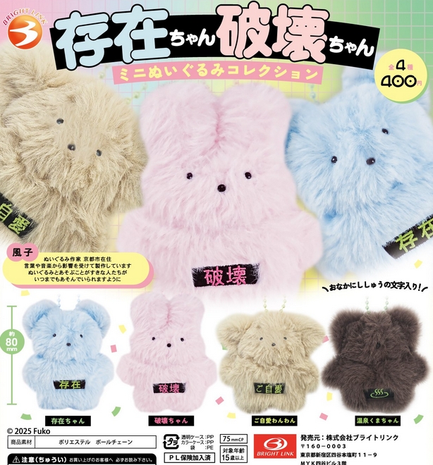 『存在ちゃん破壊ちゃん ミニぬいぐるみコレクション』発売。おなかにししゅうの文字入り! Twitter Facebook はてブ Pocket LINE コピー 2025.07.09 『存在ちゃん破壊ちゃん ミニぬいぐるみコレクション』 ◆ラインナップ <1>存在ちゃん <2>破壊ちゃん <3>ご自愛わんわん <4>温泉くまちゃん ◆メーカー:ブライトリンク ◆2025年8月発売予定 ◆400円カプセル 購入はこちら(楽天)