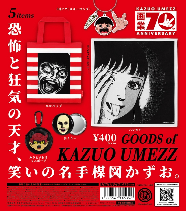 『楳図かずお グッズ』発売。独創的な世界観が詰まった、恐ろしくもユーモラスなグッズコレクション! Twitter Facebook はてブ Pocket LINE コピー 2025.07.15 『楳図かずお グッズ』 ◆ラインナップ <1>エコバック <2>ハンカチ <3>缶ミラー <4>3連アクリルキーホルダー <5>カラビナ付きミニポーチ ◆メーカー:ケンエレファント ◆2025年8月発売予定 ◆400円カプセル 購入はこちら(楽天)