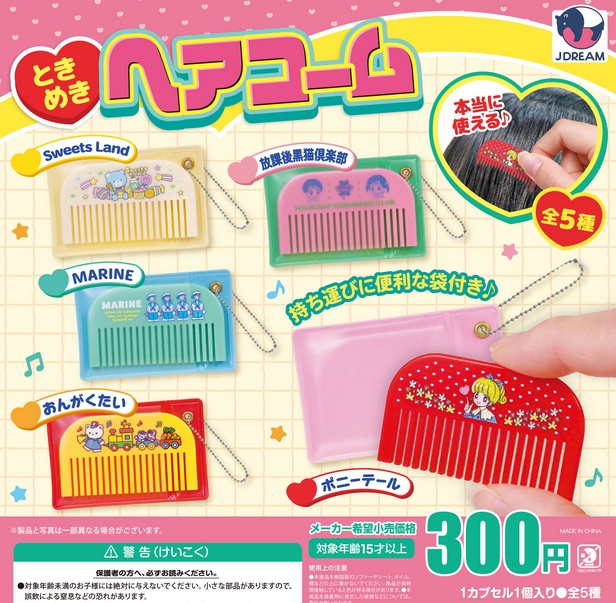 『ときめきヘアコーム』発売。ケースに入れて持ち歩ける! Twitter Facebook はてブ Pocket LINE コピー 2025.07.05 『ときめきヘアコーム』 ◆ラインナップ <1>Sweets Land <2>MARINE <3>放課後黒猫倶楽部 <4>おんがくたい <5>ポニーテール ◆メーカー:J.DREAM ◆2025年8月発売予定 ◆300円カプセル 購入はこちら(楽天)