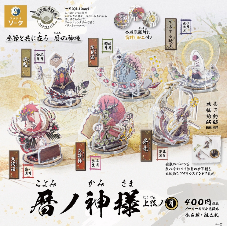 『暦ノ神様 上弦ノ月』発売。季節と共に在る暦の神様 Twitter Facebook はてブ Pocket LINE コピー 2025.10.20 『暦ノ神様 上弦ノ月』 ◆ラインナップ <1>病鬼 <2>花見猫 <3>てるてる坊主 <4>天狗猫 <5>お雛様 <6>昇竜 ◆メーカー:スタジオソータ ◆2025年11月発売予定 ◆400円カプセル 購入はこちら(楽天)