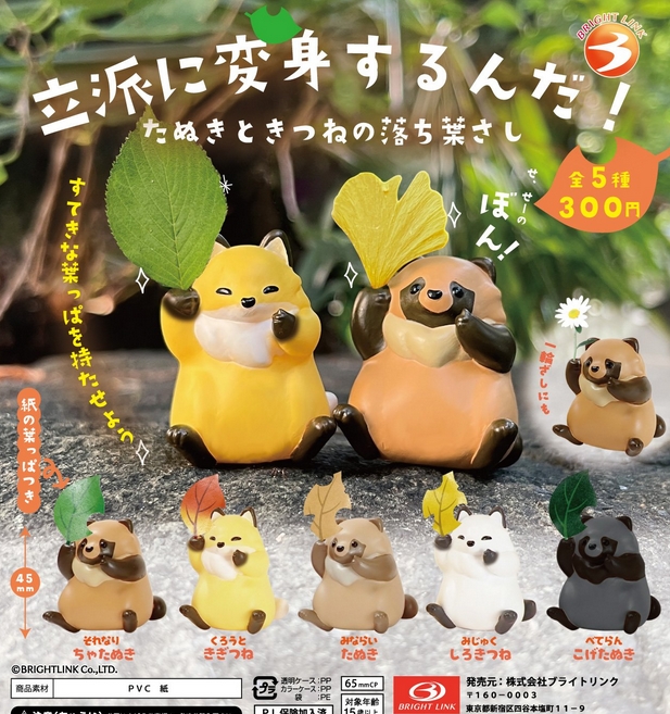 『立派に変身するんだ!』発売。たぬきときつねの落ち葉さし すてきな葉っぱを持たせよう Twitter Facebook はてブ Pocket LINE コピー 2025.10.22 『立派に変身するんだ!』 ◆ラインナップ <1>それなりちゃたぬき <2>くろうときぎつね <3>みならいたぬき <4>みじゅくしろきつね <5>べてらんこげたぬき ◆メーカー:ブライトリンク ◆2025年11月発売予定 ◆300円カプセル 購入はこちら(楽天)