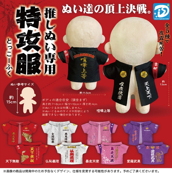 『推しぬい専用 特攻服』12月発売予定。ぬい達の頂上決戦。 Twitter Facebook はてブ Pocket LINE コピー 2025.11.07 『推しぬい専用 特攻服』 ◆ラインナップ <1>喧嘩上等 <2>天下無敵 <3>仏恥義理 <4>暴走天使 <5>愛羅武勇 ◆メーカー:ディーアイエス ◆2025年12月発売予定 ◆400円カプセル 購入はこちら(楽天)