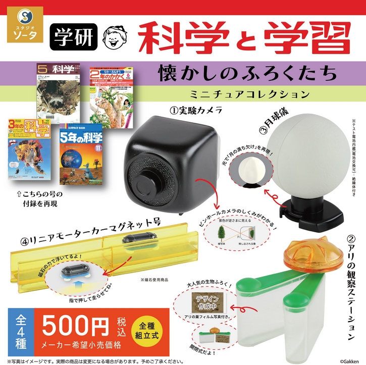 『学研 科学と学習 懐かしのふろくたち ミニチュアコレクション』12月発売予定。 Twitter Facebook はてブ Pocket LINE コピー 2025.11.12 『学研 科学と学習 懐かしのふろくたち ミニチュアコレクション』 ◆ラインナップ <1>実験カメラ <2>アリの観察ステーション <3>月球儀 <4>リニアモーターカーマグネット号 ◆メーカー:スタジオソータ ◆2025年12月発売予定 ◆500円カプセル 購入はこちら(楽天)