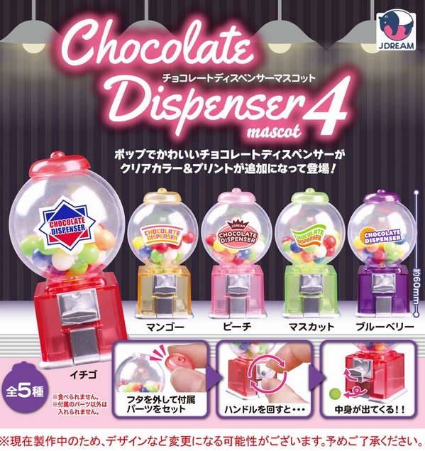 『チョコレートディスペンサーマスコット4』12月発売予定。ポップでかわいいチョコレートディスペンサーがクリアカラー&プリントが追加になって登場! Twitter Facebook はてブ Pocket LINE コピー 2025.11.12 『チョコレートディスペンサーマスコット4』 ◆ラインナップ <1>イチゴ <2>マンゴー <3>ピーチ <4>マスカット <5>ブルーベリー ◆メーカー:J.DREAM ◆2025年12月発売予定 ◆400円カプセル 購入はこちら(楽天)