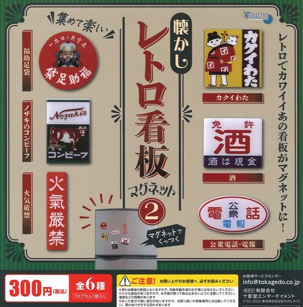 『懐かしレトロ看板マグネット2』発売。レトロでカワイイあの看板がマグネットに! Twitter Facebook はてブ Pocket LINE コピー 2025.10.29 『懐かしレトロ看板マグネット2』 ◆ラインナップ <1>福助足袋 <2>カクイわた <3>ノザキのコンビーフ <4>火気厳禁 <5>酒 <6>公衆電話・電報 ◆メーカー:十影堂エンターテインメント ◆2025年10月発売 ◆300円カプセル 購入はこちら(楽天)