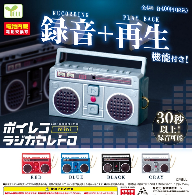 『ボイレコmini ラジカセレトロ』発売。録音+再生機能付き! Twitter Facebook はてブ Pocket LINE コピー 2025.10.30 『ボイレコmini ラジカセレトロ』 ◆ラインナップ <1>RED <2>BLUE <3>BLACK <4>GRAY ◆メーカー:エール ◆2025年10月発売 ◆400円カプセル 購入はこちら(楽天)