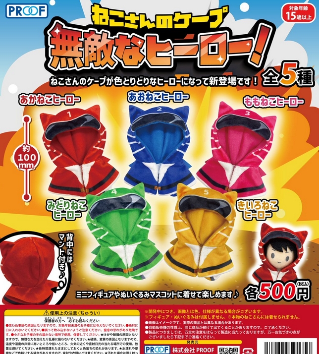 『ねこさんのケープ 無敵なヒーロー!』発売。ねこさんのケープが色とりどりなヒーローになって新登場です! Twitter Facebook はてブ Pocket LINE コピー 2025.12.15 『ねこさんのケープ 無敵なヒーロー!』 ◆ラインナップ <1>あかねこヒーロー <2>あおねこヒーロー <3>ももねこヒーロー <4>みどりねこヒーロー <5>きいろねこヒーロー ◆メーカー:PROOF ◆2026年1月発売予定 ◆500円カプセル 購入はこちら(楽天)