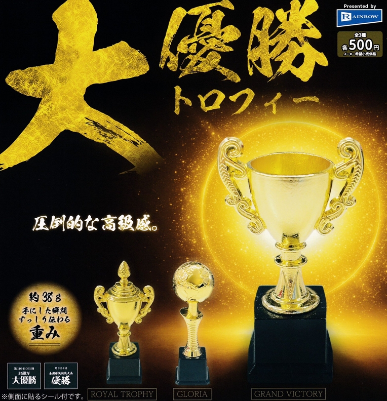 スポンサーリンク スポンサーリンク 『大優勝トロフィー』発売。圧倒的な高級感。 Twitter Facebook はてブ Pocket LINE コピー 2025.12.08 『大優勝トロフィー』 ◆ラインナップ <1>GRAND VICTORY <2>GLORIA <3>ROYAL TROPHY ◆メーカー:レインボー ◆2026年1月発売予定 ◆500円カプセル 購入はこちら(楽天)
