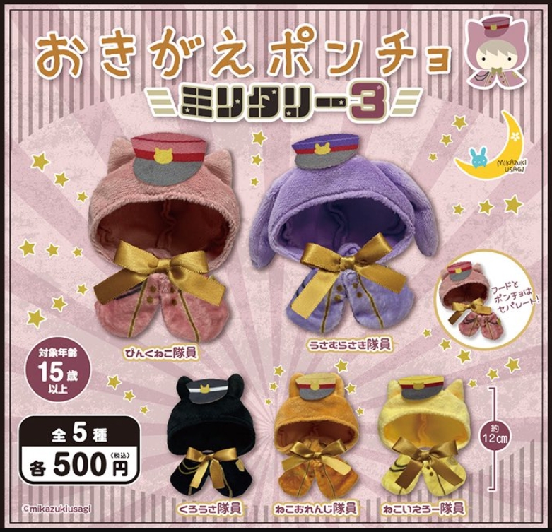 『おきがえポンチョ ミリタリー3』発売。 Twitter Facebook はてブ Pocket LINE コピー 2025.12.22 『おきがえポンチョ ミリタリー3』 ◆ラインナップ <1>ぴんくねこ隊員 <2>うさむらさき隊員 <3>くろうさ隊員 <4>ねこおれんじ隊員 <5>ねこいえろー隊員 ◆メーカー:三日月うさぎ ◆2025年1月発売予定 ◆500円カプセル 購入はこちら(楽天)