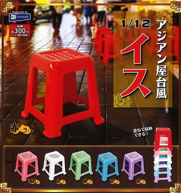 『1/12 アジアン屋台風イス』1月発売予定。重ねて収納できる! Twitter Facebook はてブ Pocket LINE コピー 2025.12.06 『1/12 アジアン屋台風イス』 ◆ラインナップ <1>赤 <2>薄紅 <3>白 <4>緑 <5>青 <6>紫 ◆メーカー:レインボー ◆2026年1月発売予定 ◆300円カプセル 購入はこちら(楽天)