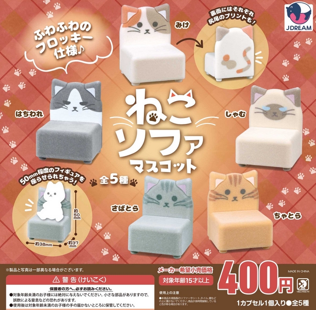 スポンサーリンク スポンサーリンク 『ねこソファマスコット』発売。ふわふわのフロッキー仕様♪50mm程度のフィギュアを座らせられちゃう! Twitter Facebook はてブ Pocket LINE コピー 2026.01.09 『ねこソファマスコット』 ◆ラインナップ <1>みけ <2>しゃむ <3>はちわれ <4>さばとら <5>ちゃとら ◆メーカー:J.DREAM ◆2026年2月発売予定 ◆400円カプセル 購入はこちら(楽天)