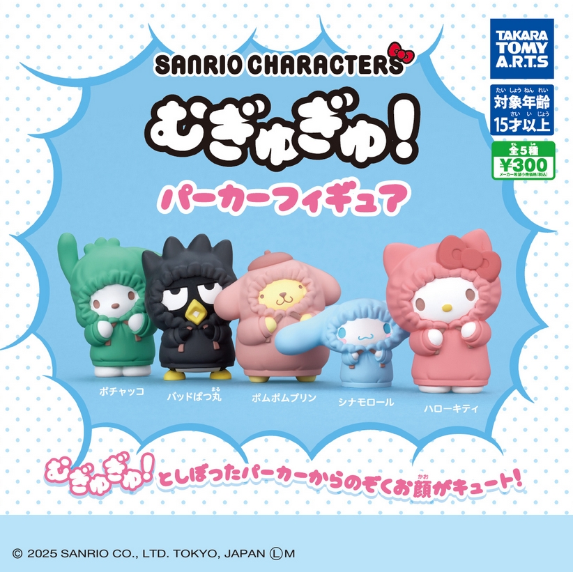 『サンリオキャラクターズ むぎゅぎゅ!パーカーフィギュア』発売!むぎゅぎゅ!としぼったパーカーからのぞくお顔がキュート! Twitter Facebook はてブ Pocket LINE コピー 2025.12.16 『サンリオキャラクターズ むぎゅぎゅ!パーカーフィギュア』 ◆ラインナップ <1>ポチャッコ <2>バッドばつ丸 <3>ポムポムプリン <4>シナモロール <5>ハローキティ ◆メーカー:タカラトミーアーツ ◆2025年12月発売 ◆300円カプセル 購入はこちら(楽天)