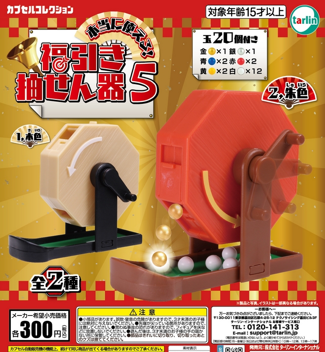 『福引き抽せん器5』発売。 Twitter Facebook はてブ Pocket LINE コピー 2025.12.22 『福引き抽せん器5』 ◆ラインナップ <1>木色 <2>朱色 ◆メーカー:ターリン・インターナショナル ◆2025年12月発売 ◆300円カプセル 購入はこちら(楽天)