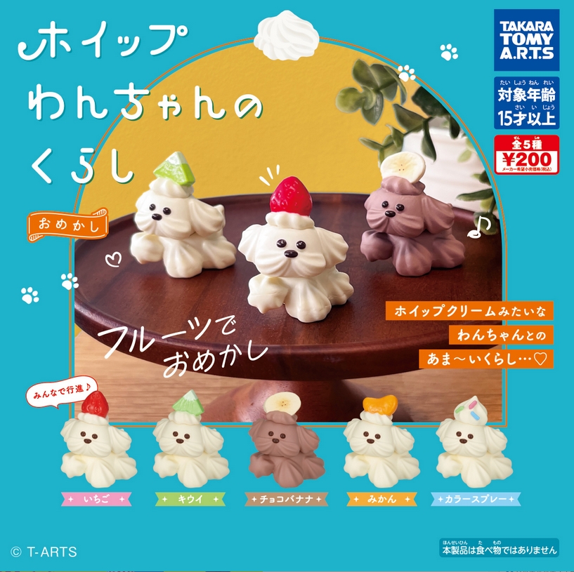 『ホイップわんちゃんのくらし おめかし』発売!ホイップクリームみたいなわんちゃんとの あま~いくらし…♡ Twitter Facebook はてブ Pocket LINE コピー 2025.12.25 『ホイップわんちゃんのくらし おめかし』 ◆ラインナップ <1>いちご <2>キウイ <3>チョコバナナ <4>みかん <5>カラースプレー ◆メーカー:タカラトミーアーツ ◆2025年12月発売 ◆200円カプセル 購入はこちら(楽天)
