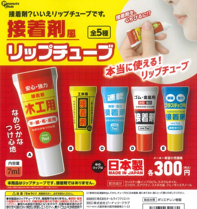 『接着剤風 リップチューブ』発売。なめらかなつけ心地。接着剤?いいえリップチューブです。 Twitter Facebook はてブ Pocket LINE コピー 2025.12.30 『接着剤風 リップチューブ』 ◆ラインナップ <1>A <2>B <3>C <4>D <5>E ◆メーカー:Peanuts Club ◆2025年12月発売 ◆300円カプセル 購入はこちら(楽天)