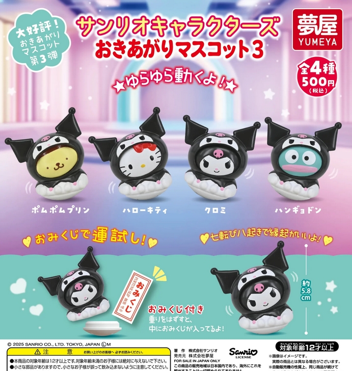 『サンリオキャラクターズ おきあがりマスコット3』発売。おみくじで運試し! Twitter Facebook はてブ Pocket LINE コピー 2026.01.09 『サンリオキャラクターズ おきあがりマスコット3』 ◆ラインナップ <1>ポムポムプリン <2>ハローキティ <3>クロミ <4>ハンギョドン ◆メーカー:ご当地夢屋本舗 ◆2026年1月発売 ◆500円カプセル 購入はこちら(楽天)