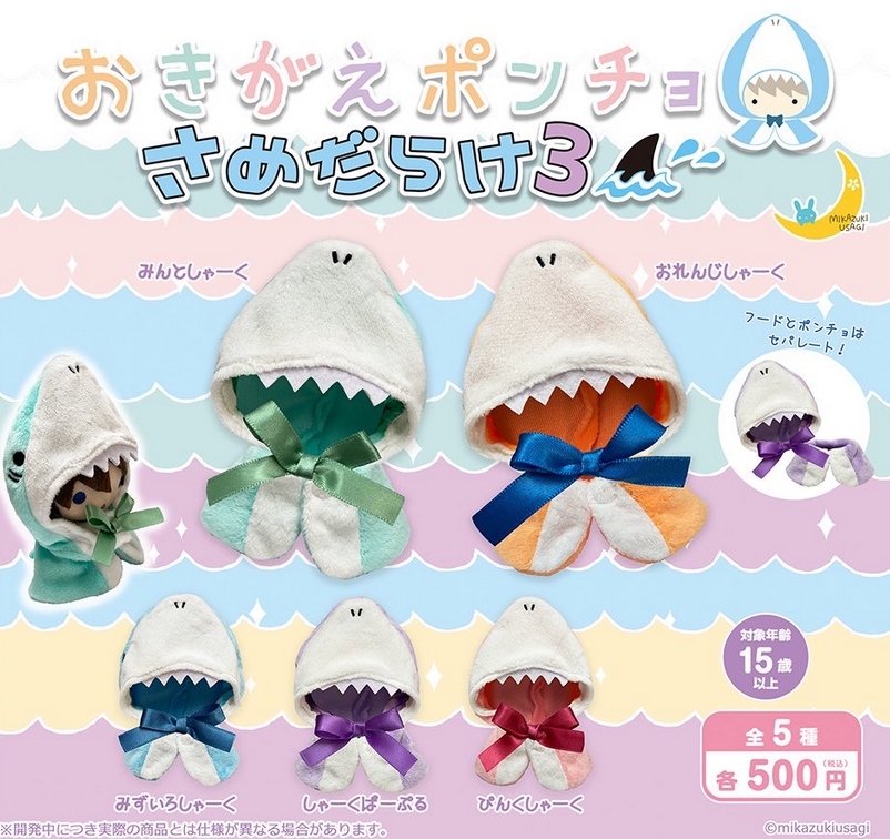 『おきがえポンチョ さめだらけ3』3月発売予定。 Twitter Facebook はてブ Pocket LINE コピー 2026.02.07 『おきがえポンチョ さめだらけ3』 ◆ラインナップ <1>みんとしゃーく <2>おれんじしゃーく <3>みずいろしゃーく <4>しゃーくぱーぷる <5>ぴんくしゃーく ◆メーカー:三日月うさぎ ◆2026年3月発売予定 ◆500円カプセル 購入はこちら(楽天)