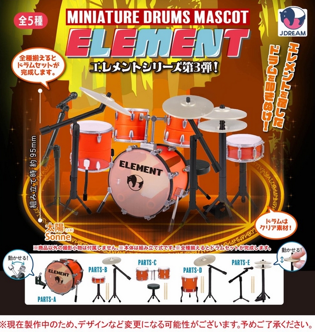 『ミニチュアドラムマスコット エレメント』3月発売予定。エレメントを宿したドラムを叩きぬけ! Twitter Facebook はてブ Pocket LINE コピー 2026.02.07 『ミニチュアドラムマスコット エレメント』 ◆ラインナップ <1>PARTS-A <2>PARTS-B <3>PARTS-C <4>PARTS-D <5>PARTS-E ◆メーカー:J.DREAM ◆2026年3月発売予定 ◆500円カプセル 購入はこちら(楽天)