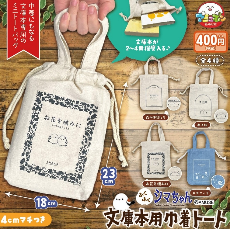 『ふくふくシマエナガ 文庫本用巾着トート』3月発売予定。巾着にもなる文庫本専用のミニトートバッグ。文庫本が2~4冊程度入る♪ Twitter Facebook はてブ Pocket LINE コピー 2026.02.05 『ふくふくシマエナガ 文庫本用巾着トート』 ◆ラインナップ <1>森の仲間たち <2>本と旅 <3>お花を摘みに <4>ネモフィラ ◆メーカー:アミューズ ◆2026年3月発売予定 ◆400円カプセル 購入はこちら(楽天)