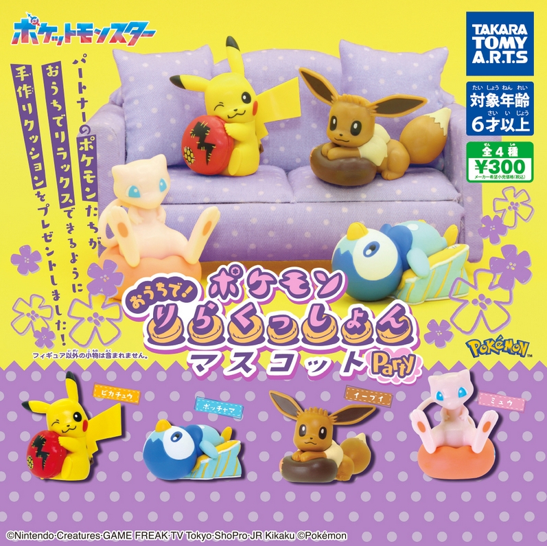 『ポケモン おうちで!りらくっしょんマスコット party』発売。 Twitter Facebook はてブ Pocket LINE コピー 2026.01.21 『ポケモン おうちで!りらくっしょんマスコット party』 ◆ラインナップ <1>ピカチュウ <2>イーブイ <3>ポッチャマ <4>ミュウ ◆メーカー:タカラトミーアーツ ◆2026年1月発売 ◆300円カプセル 購入はこちら(楽天)