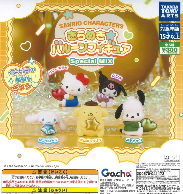 『サンリオキャラクターズ きらめき☆バルーンフィギュア Special MIX』発売!キラキラの風船をぎゅっ Twitter Facebook はてブ Pocket LINE コピー 2026.02.11 『サンリオキャラクターズ きらめき☆バルーンフィギュア Special MIX』 ◆ラインナップ <1>ハローキティ <2>クロミ <3>シナモロール <4>ポムポムプリン <5>ポチャッコ ◆メーカー:タカラトミーアーツ ◆2026年2月発売 ◆300円カプセル 購入はこちら(楽天)