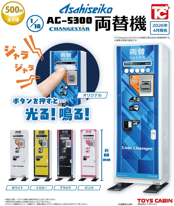 スポンサーリンク スポンサーリンク 『旭精工 1/18 AC-5300 両替機』4月発売予定。ボタンを押すと…光る!鳴る! Twitter Facebook はてブ Pocket LINE コピー 2026.03.18 『旭精工 1/18 AC-5300 両替機』 ◆ラインナップ <1>オリジナル <2>ホワイト <3>イエロー <4>ブラック <5>ピンク ◆メーカー:トイズキャビン ◆2026年4月発売予定 ◆500円カプセル 購入はこちら(楽天)