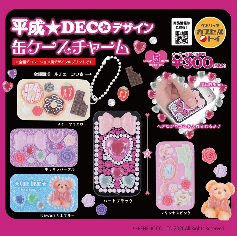 スポンサーリンク スポンサーリンク 『平成★DECOデザイン 缶ケースチャーム』発売。 Twitter Facebook はてブ Pocket LINE コピー 2026.02.25 『平成★DECOデザイン 缶ケースチャーム』 ◆ラインナップ <1>ハートブラック <2>キラキラパープル <3>Kawaiiくまブルー <4>プリンセスピンク <5>スイーツイエロー ◆メーカー:ベネリック ◆2026年2月発売 ◆300円カプセル 購入はこちら(楽天)